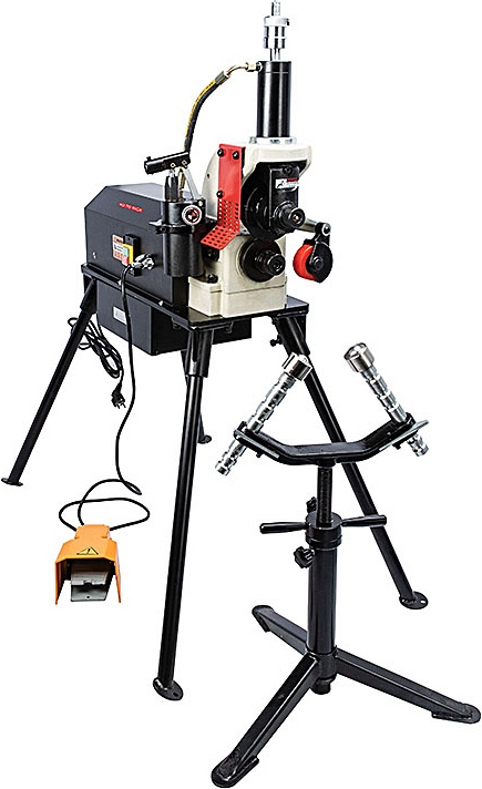 - Полная комплектация всем необходимым для работы: в комплектацию входит все необходимое – сменные прижимные валы с накатными роликами, опора для труб, ножная педаль пуска, набор необходимых инструментов