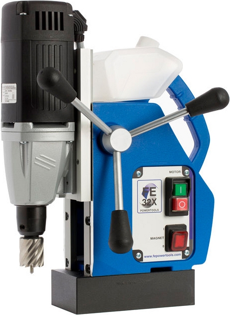 Магнитный сверлильный станок FE 32 X (ФИ 32 Х) на магнитном основании предназначен для сверления сквозных отверстий Ø 12 – 32 мм корончатыми сверлами, Ø до 13 мм спиральными сверлами в заготовках.